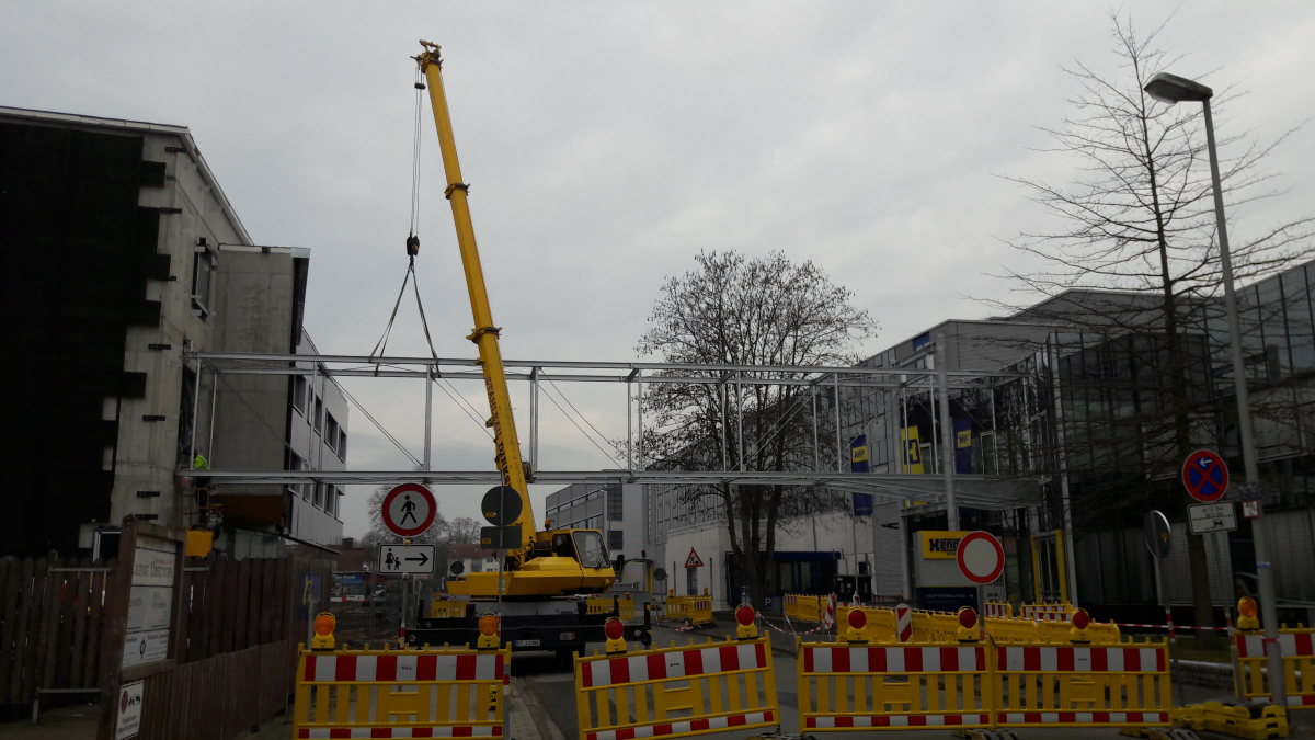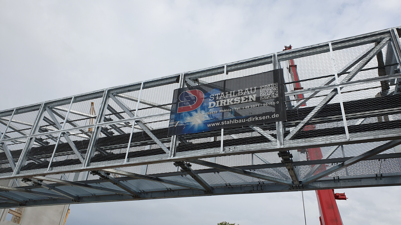 Gesamte Konstruktion in feuerverzinkter Ausführung. Beauftragt wurden Planung, Fertigung und Montage sowie Dacheindeckung und unterseitige Verkleidung der Brücke.