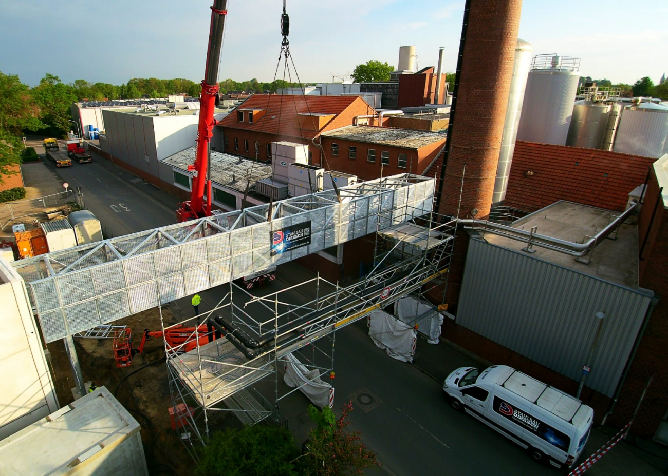 Verbindungsbrücke zwischen 2 Bürogebäuden, frei gespannt über eine öffentliche Straße